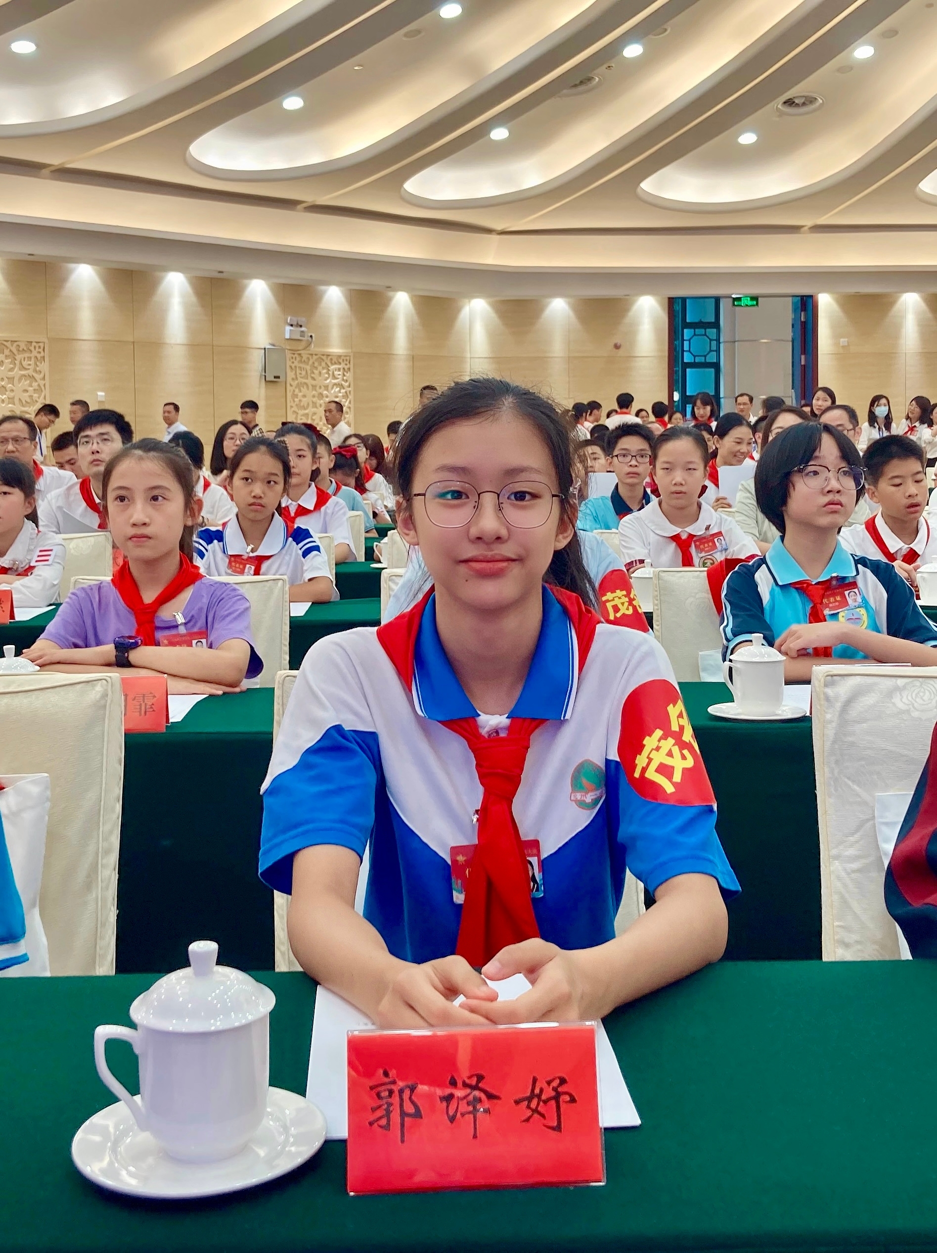 郭译妤,现为化州市第四中学七年级6班班长、化州市少工委委员、中国少年先锋队广东省第八次代表大会代表。曾入选2025年广东“新时代好少年”,荣获全国“红领巾奖章”个人五星章、广东省“红领巾奖章”个人四星章,被评为茂名市新时代好少年、茂名市优秀少先队员、茂名市好心少年、化州市新时代好少年、化州市优秀少先队员,并多次获评校级优秀少先队员、三好学生、优秀班干部。